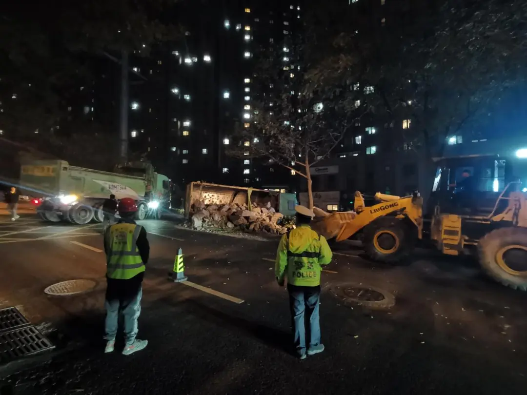渣土车侧翻堵了主干道,乐鱼篮球“清道夫”上阵4小时清障